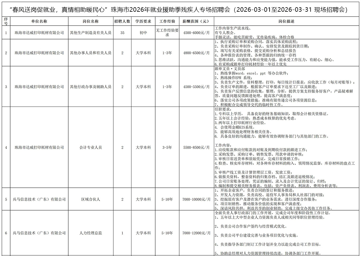 “春风送岗促就业,真情相助暖民心”珠海市2026年就业援助季残疾人专场招聘会(2026-03-01至2026-03-31 现场招聘会)